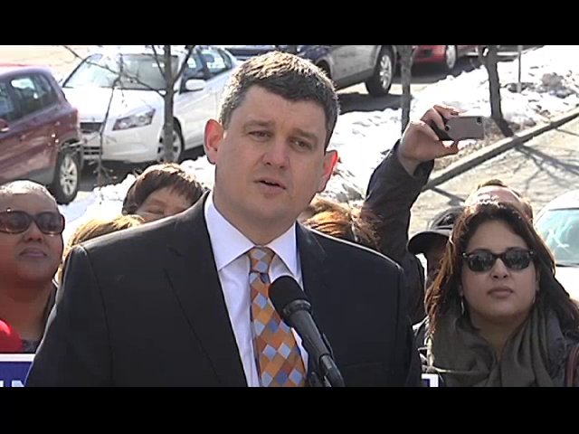 ^ Dan Conley campaigning at Gate of Heaven parish hall on April lst.