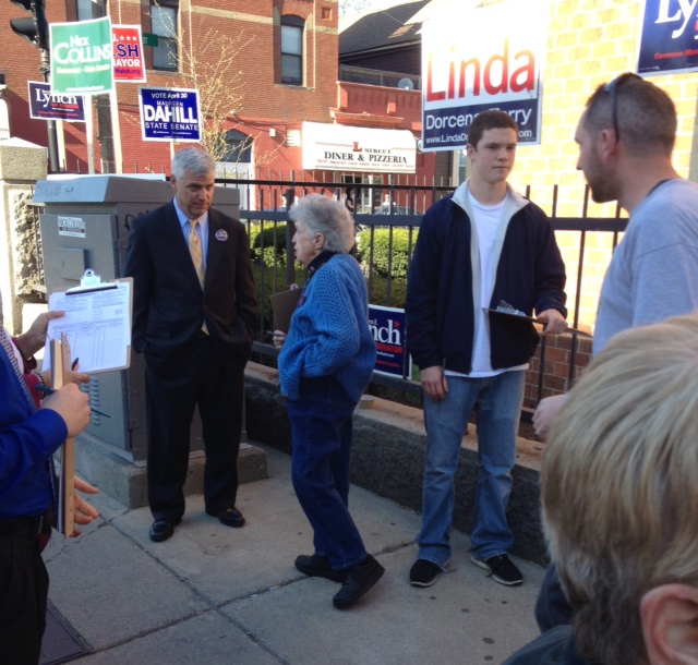 But that’s not the whole story. Conley has paid much attention for months now to South Boston. He campaigned there on April lst, when that neighborhood (and Dorchester) chose a new State Senator. (Here and Sphere photographed him that day campaigning among voters at Gate of Heaven parish hall, where two South Boston precincts voted.) South Boston is still home to large numbers of city and county employees; and Conley’s Irish name surely still draws many votes in the City’s archetypal Irish-name neighborhood (though that is changing, as we all know).
