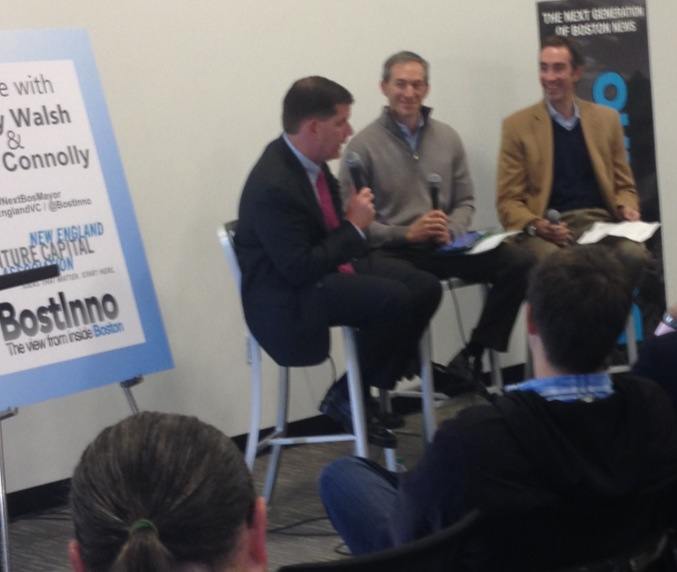 Some questions that Connolly would have dined on, Walsh ducked. Asked “how will you win the support of THIS community as you have the unions,” Walsh said “Innovation will be central to my cabinet.” To, ” a question about keeping the city open late at night, he offered “if people want to get a meal late or to install a juke box” — he laughed : “do they still call it that ?” — “it’s a matter of permitting.” Quizzed on what will be his Big Idea — the moderators cited New York mayor Bloomberg creating a technology campus high school — Walsh said “not sure….growing the City is what I’m focused on.”