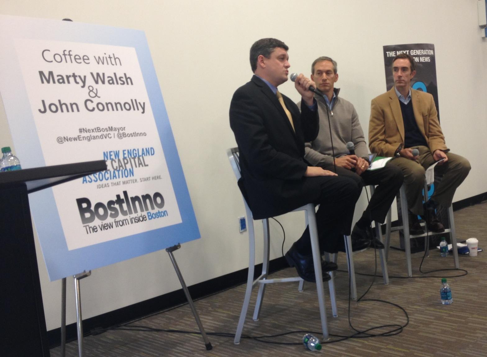 One candidate speaks the syntax of hi-technology, the other means well. The folks who bring us the media publication BostInno — voice of the “Innovation District,” Inno for short — know the difference. They go first-name with john Connolly, who helped set up the Inno; with Marty Walsh, not so readily. Yet at this morning’s Forum the moderators clearly appreciated Walsh’s humility and readiness to listen to the concerns of people very different from his base. Walsh’s 45 minutes of question and answer showed him at his best : not exactly ready with the answer, and willing to be seen as such. And when an answer was given, it proved practical; and the Forum attendees appreciated Walsh’s practicality and laughed at his self-deprecations. But his answers also proved revealing.