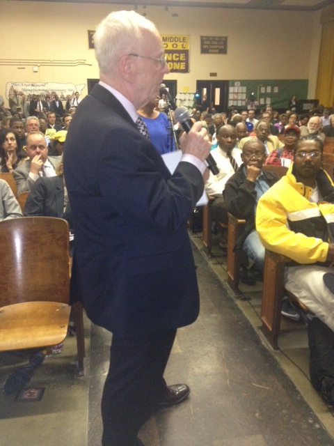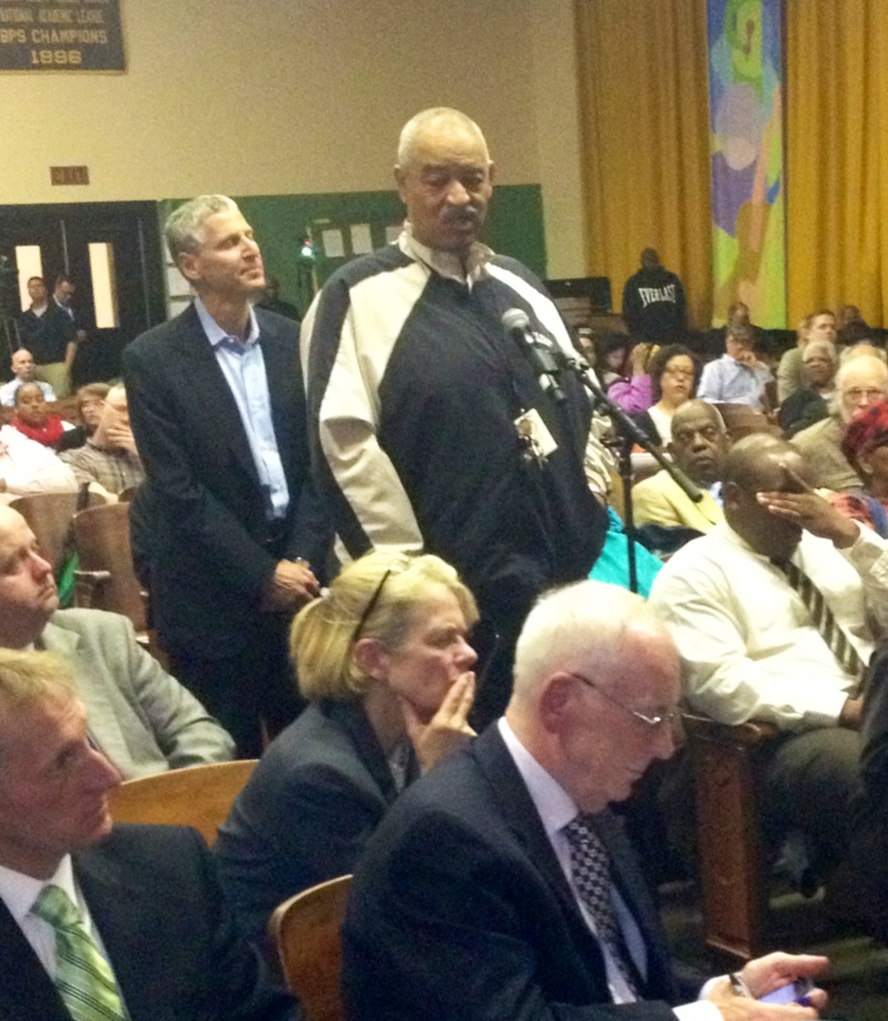 ^ School Superintendent John McDonough answering a school question posed to Mayor Walsh