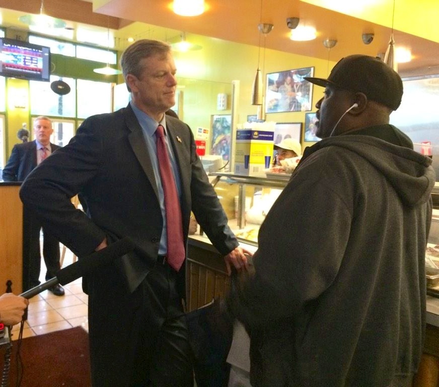 Charlie baker in Grove Hall, boston, with Larry Ellison of the Minority Officers association endorsing him and accompanying him