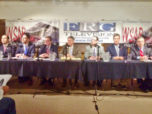 ^ Mayor Flanagan, nose in the air; to his right, six of his seven challengers : Shawn Cadime, David Dennis, Sam Sutter, Ronald Cabral, Paul Anderson, Mike Miozza