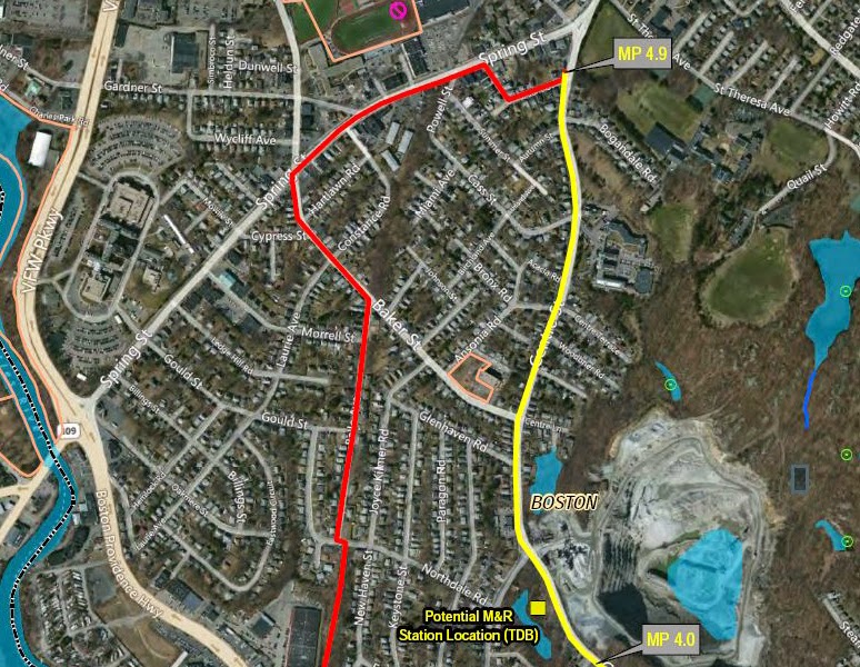 But where ? From the proposed line’s start, in the eastern end of the town of Westwood, can a route not be found through more or less industrial east Dedham, Readville, and the Reservation, along the road that joins up with LaGrange Street at St John’s Church on Washington Street ? Or perhaps the pipeline can be laid deeper underground than the proposed five feet ? One would also like to know why the Spring Street route, along Baker Street to the old, now abandoned rail line that runs into Dedham thence to Dedham centre, was ruled out.