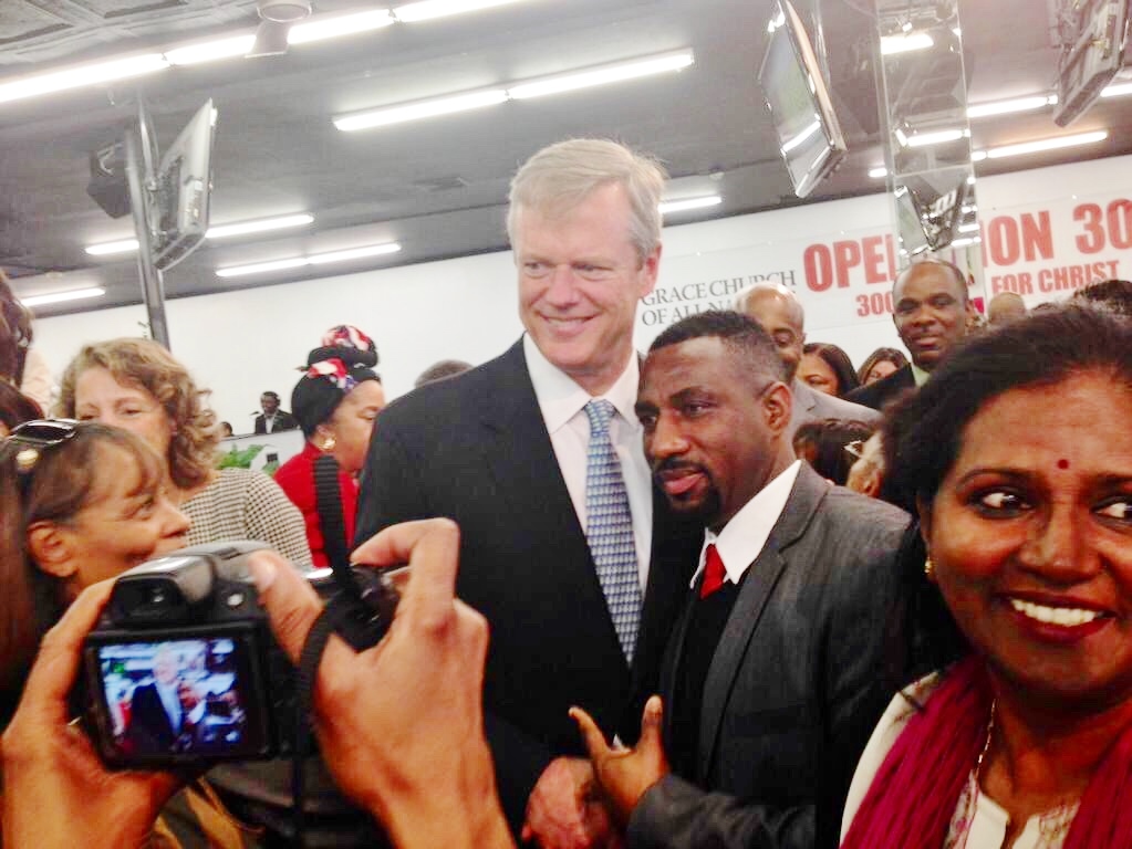 ^ Governor Baker ; with boston City Councillor Tim McCarthy (L) and at Grace Church of All nations (R)