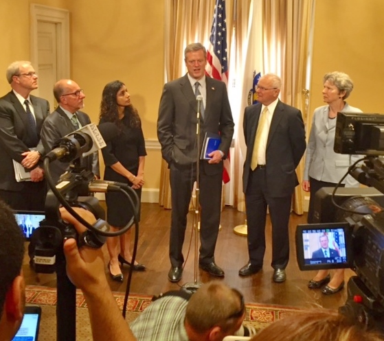 Today, at a major press conference, Baker was joined by the Deans of the Boston area’s top four medical schools — Harvard, Tufts, Boston University, and UMass — and by Dr. Dennis Dimitri, President of the Massachusetts Medical Society as well as by his own Department of Health Commissioner, Dr. Monica Bharel. said baker, “the number of opioid deaths is going up steeply” — he made a steep-slope gesture with his arm — ‘and we can’t move fast enough to deal with it.” By which he meant, “we can’t possibly move too fast because the death incidence is rising that steeply.”