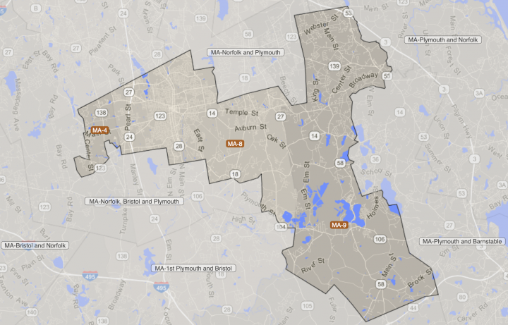 ^ map of the 2nd Bristol and Plymouth State Senate District, stretching from Easton past Brockton to Whitman, Hanover, Hanson, Halifax, East Bridgewater and Plympton