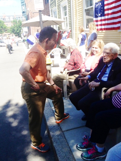 ^ Democratic convention nominee Steve Grossman chats up legendary Charlestown pol Gerard Doherty on Union Street, at Bunker Hill Day parade